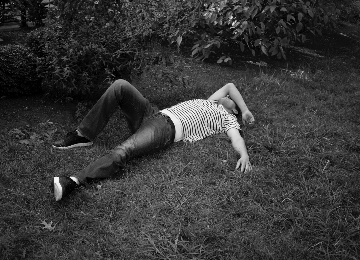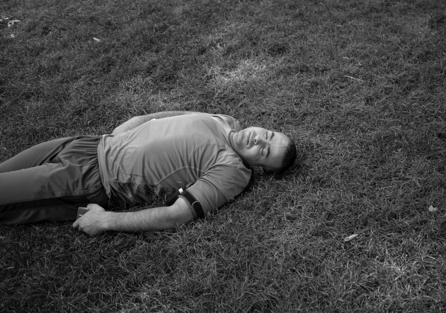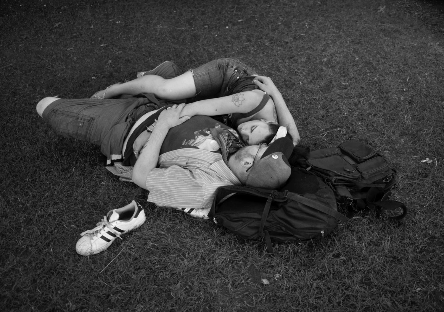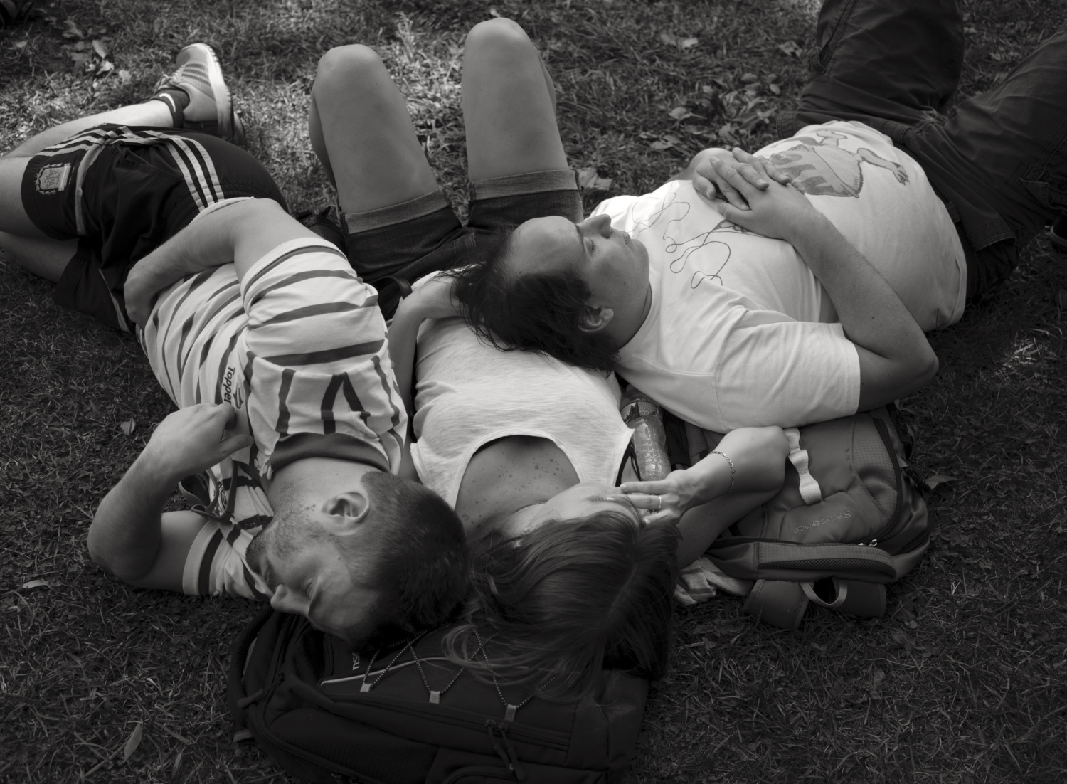 After about three years of working on The Chair Pictures, I began feeling I’d explored as many permutations as I could think of with nothing but the wooden chair. I returned to my first love, street photography. While I continued to take the kinds of street pictures I had in the past, I also found myself intuitively breaking one of my own rules: To ask if I may before I took someone’s photo. The first picture I took in the Sleepers in the Park series is also the first presented here: a young couple asleep on the grass, their bodies intertwined. There was something so arresting about the graphic quality of their pose, as well as the tenderness expressed by their embrace. I couldn’t resist.