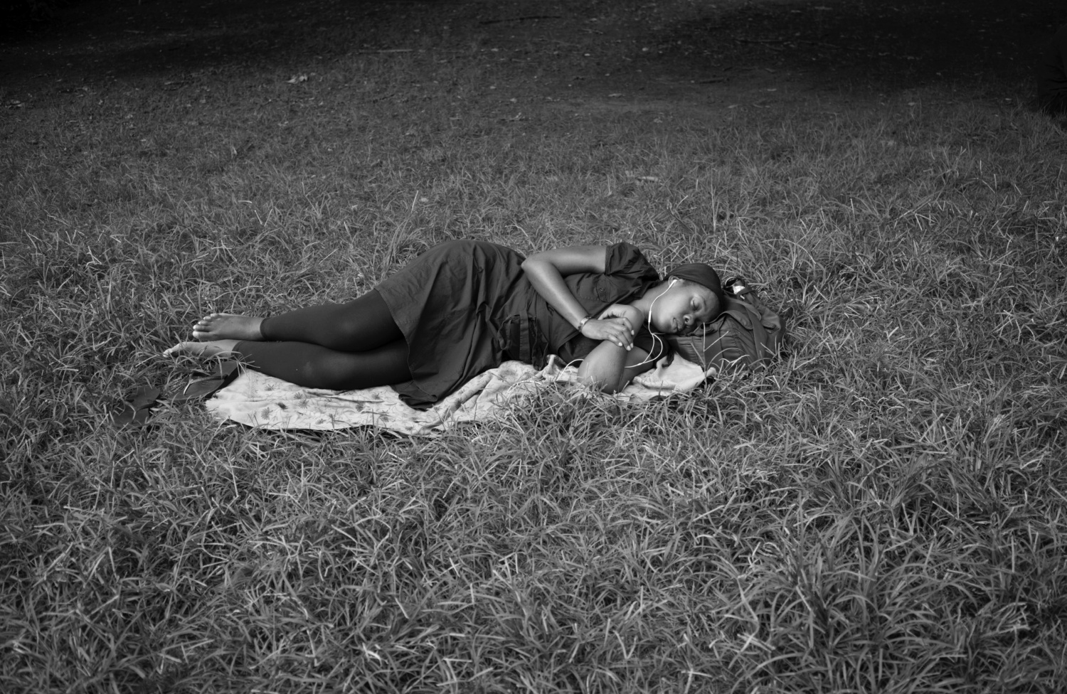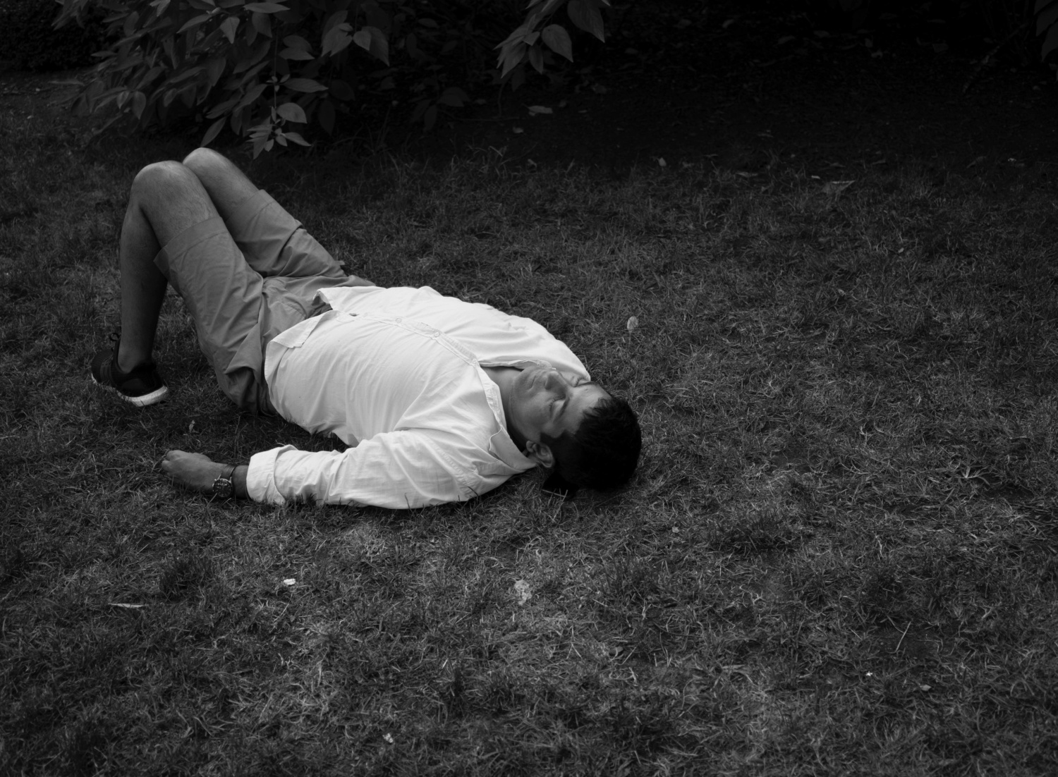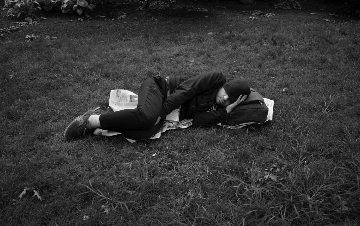 After about three years of working on The Chair Pictures, I began feeling I’d explored as many permutations as I could think of with nothing but the wooden chair. I returned to my first love, street photography. While I continued to take the kinds of street pictures I had in the past, I also found myself intuitively breaking one of my own rules: To ask if I may before I took someone’s photo. The first picture I took in the Sleepers in the Park series is also the first presented here: a young couple asleep on the grass, their bodies intertwined. There was something so arresting about the graphic quality of their pose, as well as the tenderness expressed by their embrace. I couldn’t resist.