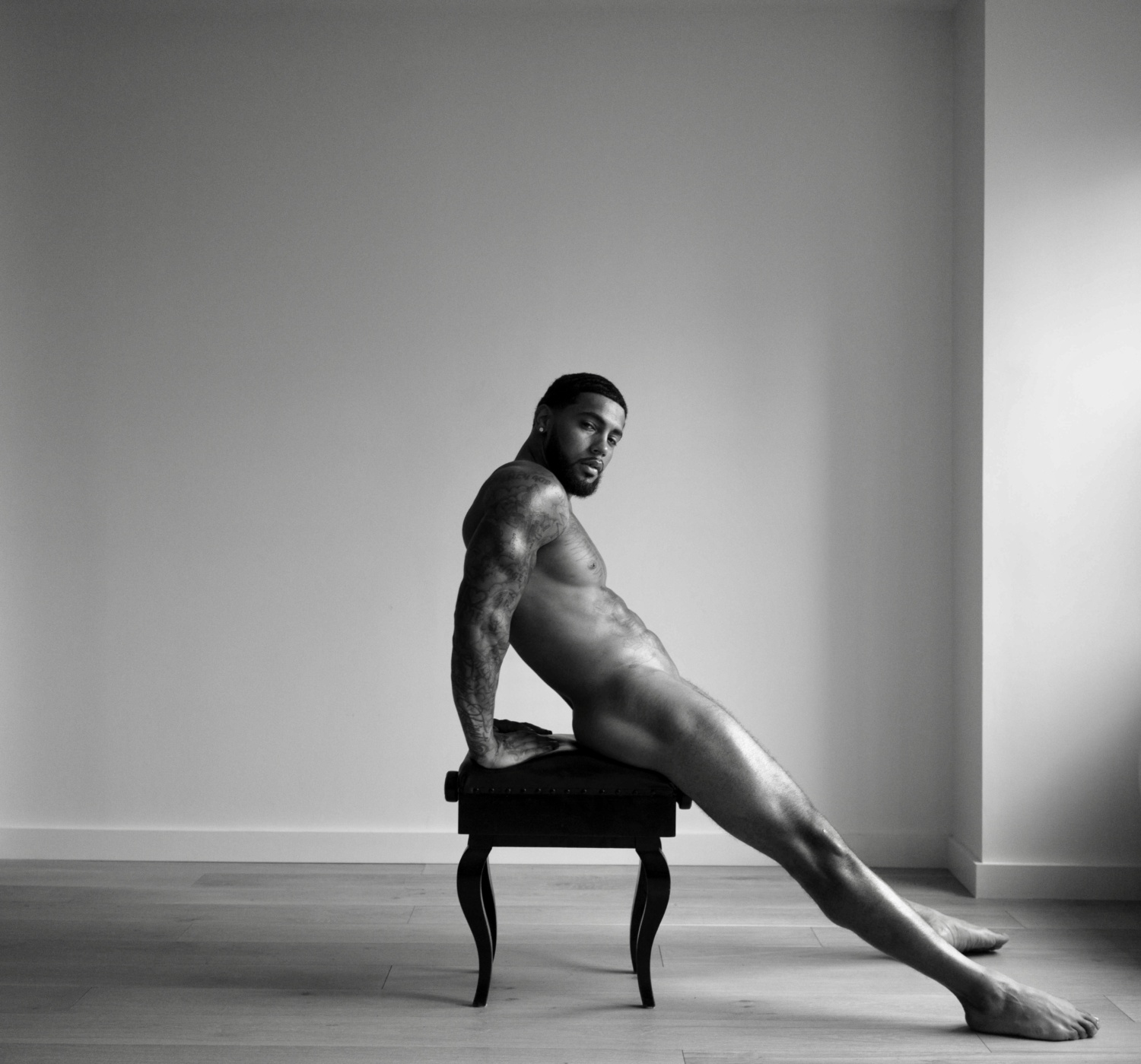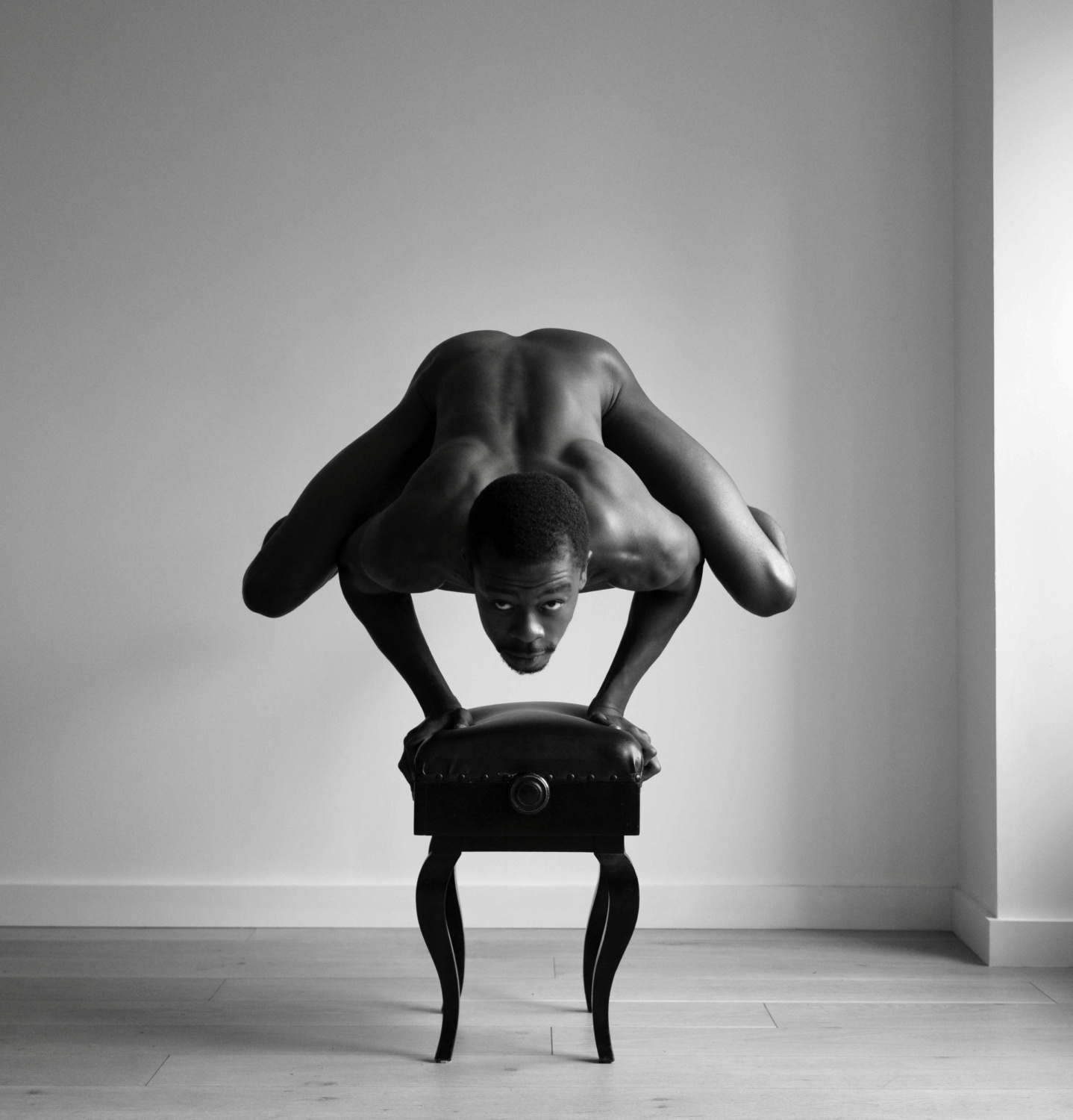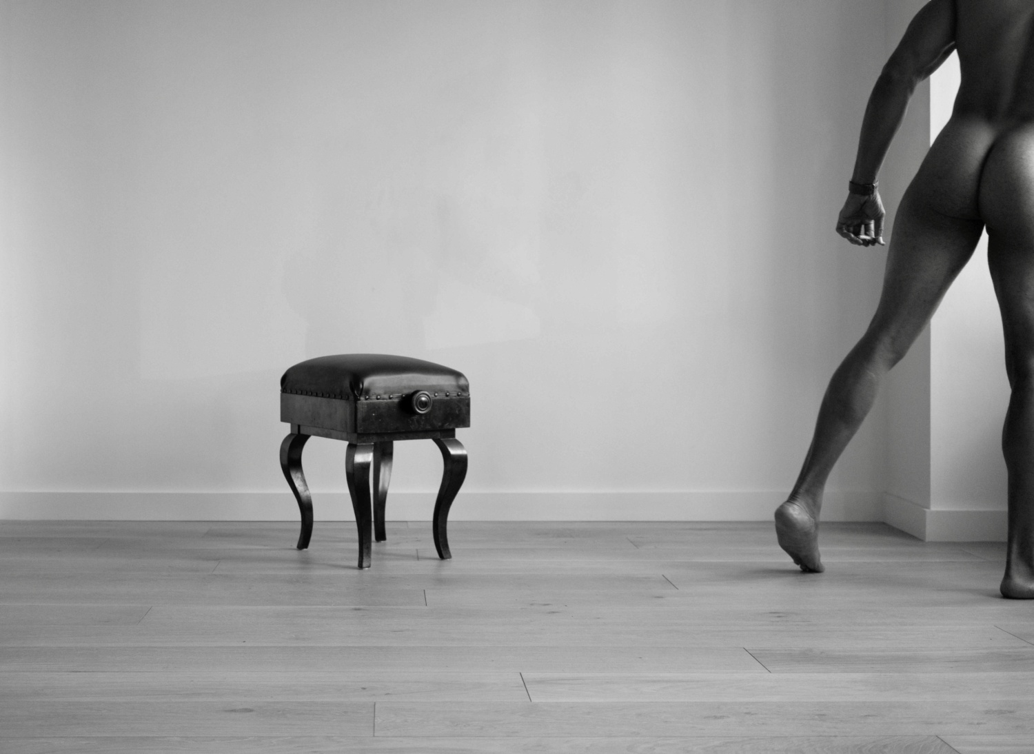 I moved into my new home in April 2019. A couple weeks later, I had a shoot with a guy I’d hired as a model. (By now, I was interested in trying something new, exploring another genre: nudes.) I pulled out my wooden chair and took some photos, but it was as if the relationship between us had fizzled; the chemistry was no longer there. Then I suddenly thought of the piano bench; its legs were as shapely as those of especially muscular calves, but it had a dainty elegance at the same time. I placed it in front of the stark white wall. The naked model perched atop, and, as I began snapping pictures, I knew in an instant that the piano bench and I were about to embark on the photographic equivalent of a romance.