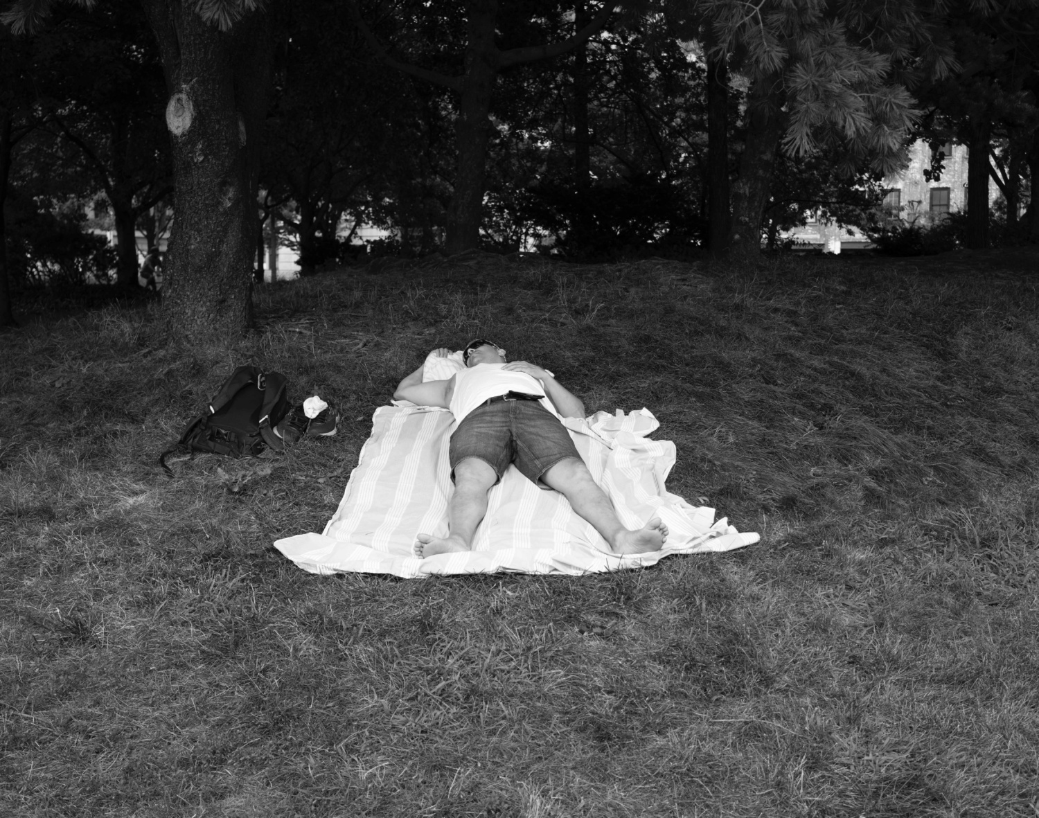 From then on, I actively looked for people sleeping in parks when I went out with my camera; this was something I saw only in the summertime in New York. Although I wasn’t conscious of it at the time, I see now that these pictures were the exact opposite of The Chair Pictures. Rather than bring the outdoors in, here I was capturing what is normally done indoors—inside one’s bedroom—outdoors. Sleeping is such a deeply private—even intimate—human activity (or is it a mode of inactivity?) and I was fascinated that anyone could even attempt to sleep in public. It suggested a vulnerability and trust that I found moving. But also, spooky.